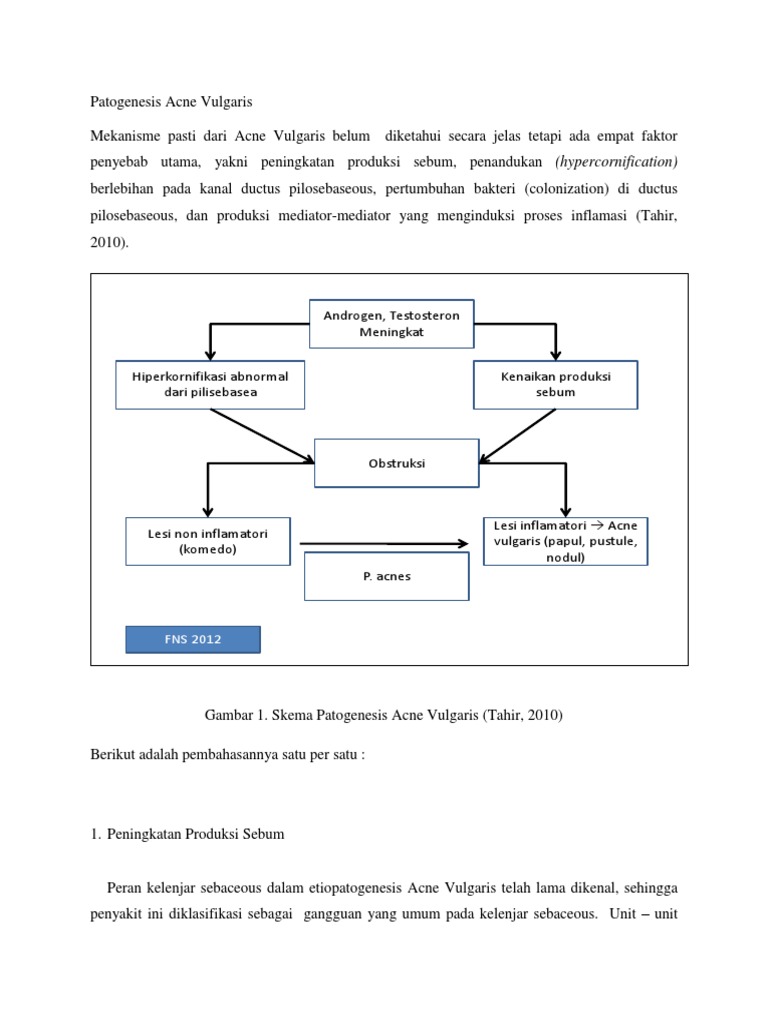 Peningkatan produksi sebum Menurut Kligman sebum ibarat minyak lampu pada ini. Berdasarkan penelitian terbaru patofisiologi jerawat acne vulgaris dikategorikan berdasarkan beberapa faktor penyebab yaitu pelepasan mediator inflamasi ke dalam kulit hiperkeratinisasi folikular bakteri Propionibacterium acnes dan produksi sebum. Acne Vulgaris Seorang perempuan berusia 17 tahun dating ke poliklinik kulit dan kelamin dengan keluhan bitnik-bintik merah pada wajah dagu dan dahi sejak 1 bulan yang lalu.