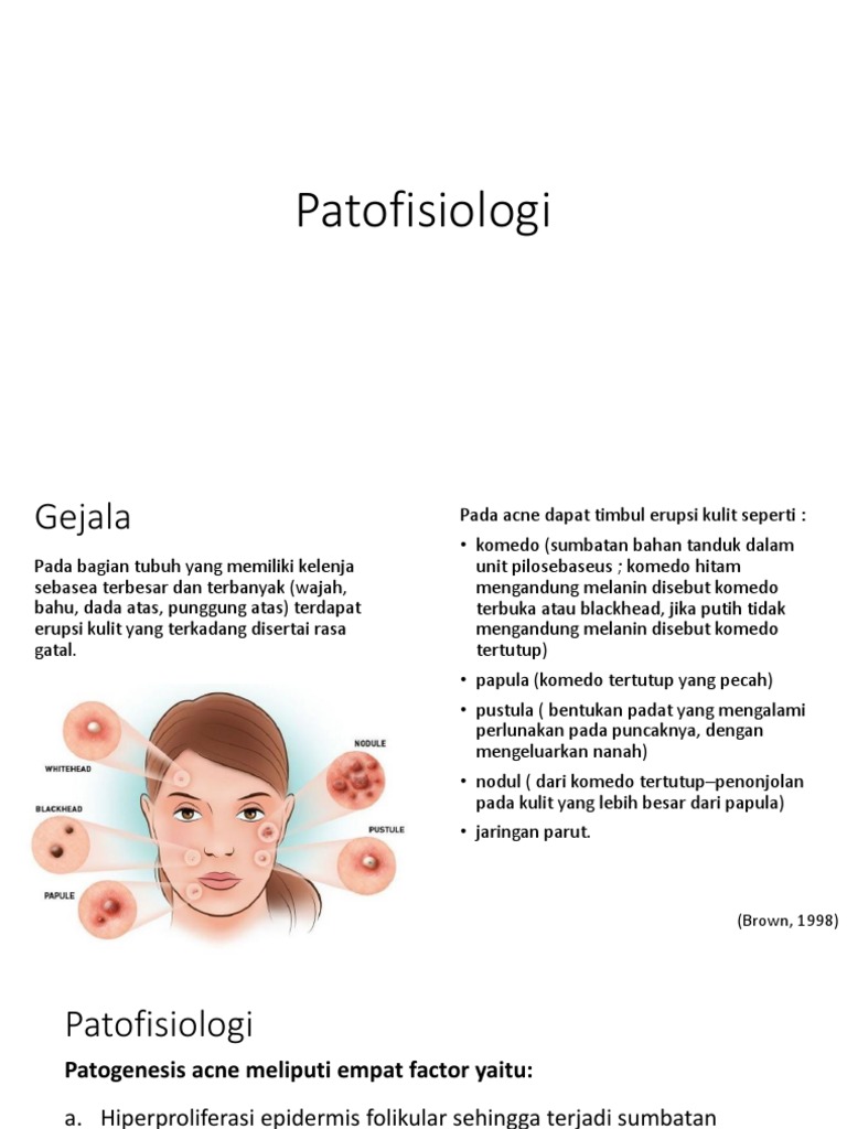 Patofisiologi acne vulgaris. Patofisiologi Acne Vulgaris Acne vulgaris ditandai dengan komedo noninflamasi terbuka atau tertutup dan oleh papula pustula dan nodul yang meradang. Acne vulgaris biasanya mempengaruhi area kulit dengan populasi folikel sebasea yang paling padat. Pada pemeriksaan dermatologis didapatkan komedo papul dan nodul.
