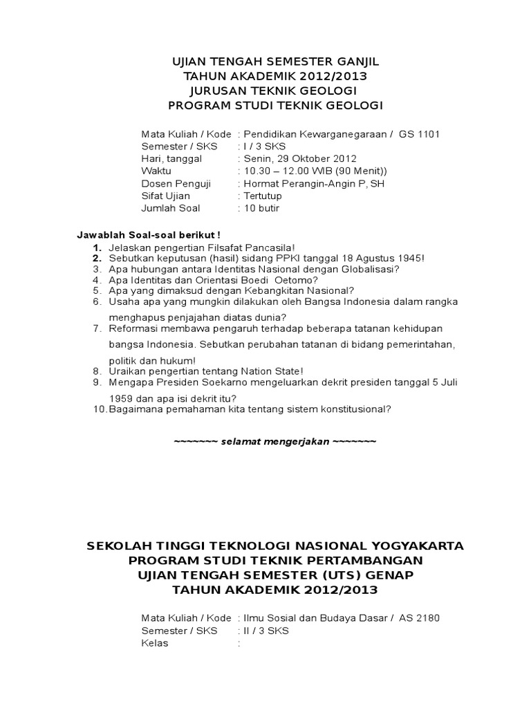 Soal Uts Pendidikan Kewarganegaraan Perguruan Tinggi Semester 1 Seputaran Guru